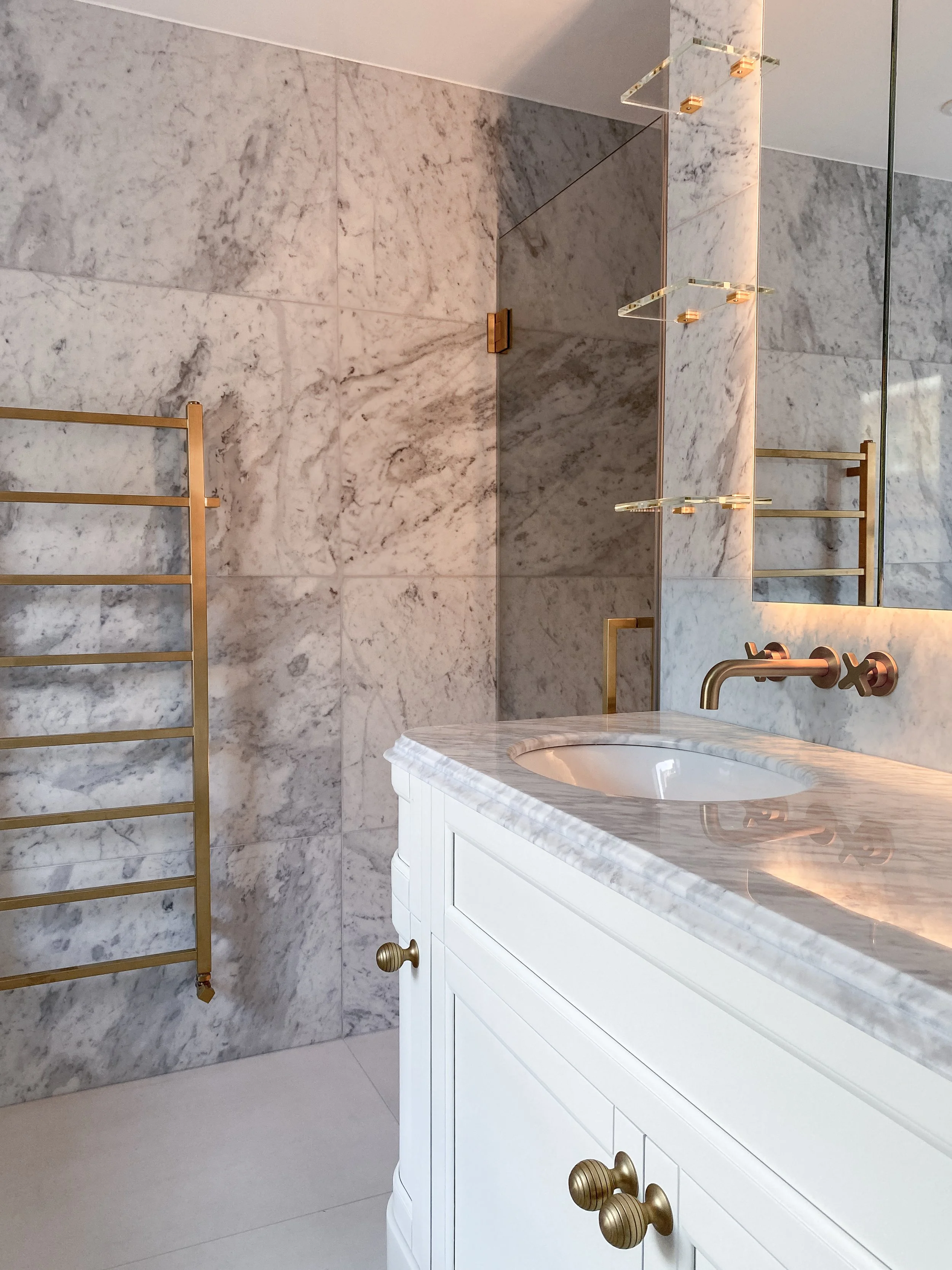 Nestled in the heart of Kensington, we transformed the space into a serene sanctuary, a retreat that captures the calm and refined luxury of a spa. The design centres on Bianco Carrara marble paired with warm brass finishes, creating an elegant yet timeless palette. At its heart sits a standout shaker style vanity, topped with marble, blending classic detailing with effortless sophistication.